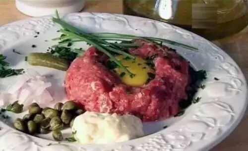 实际情况:纯生牛肉末,配各种口味诡异的香料,再搅和上一个纯生鸡蛋。