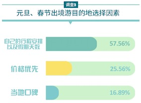 越来越多的年轻人寻求自由,释放个性,热爱旅行。但对于年轻人尤其是90后年轻人来说,他们还在奋斗期,出境游过长的日程和高昂的价格是“痛 点”。本次调查中,有57.56%的用户认为行程安排及天数成为他们选择目的地的决定因素;25.56%的用户遵循是价格优先的原则;16.89%的用户 则更看重旅游目的地再当地的口碑。而在出国游玩天数的调查中,不少年轻人表示,游玩5-7天的旅行是他们能够接受的,这一比例在元旦和春节分别达到了 35%和56%。