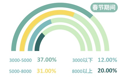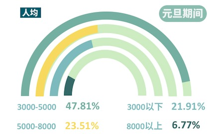 而春节出境游人均预算5000以下的比例为49%,5000-8000元以上的比例为31%,预算8000以上的更是达到了20%,由于春节假期时间长且长线游比例增加,因而与元旦相比预算有所提高。