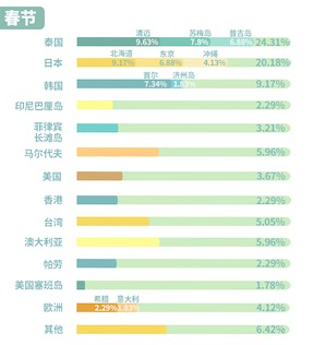 选择春节去泰国、韩日等周边国家情况与元旦相比态势依旧稳定,其中澳大利亚由于春季达到最旺季节,增长幅度较为明显,提升到了5.96%。